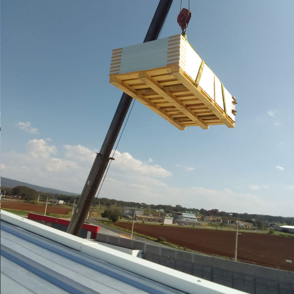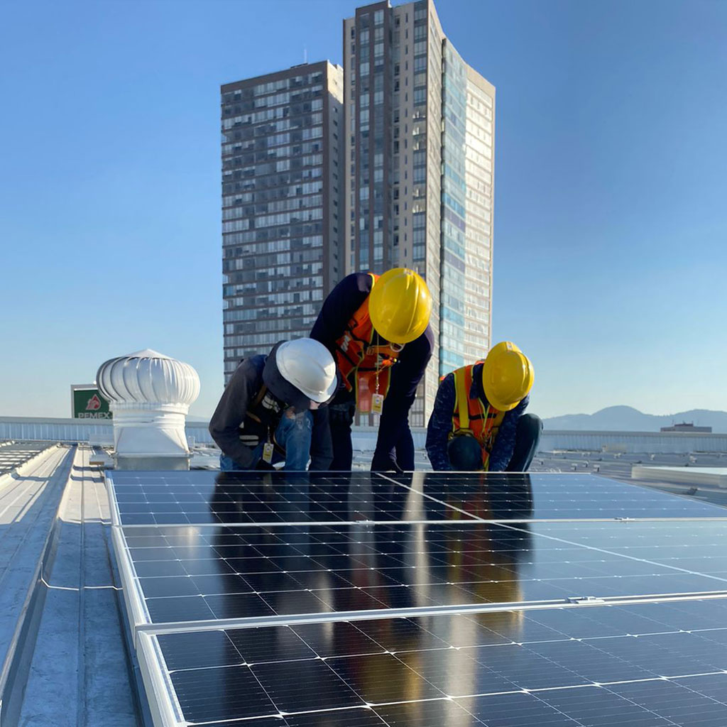 21 módulos solares interconectados a la red eléctrica, alcanzando una capacidad instalada total de 12.285 kWp en *Construplaza*, ubicada en Pachuca, Hgo. Este sistema contribuye a la eficiencia energética de la plaza, disminuyendo su consumo eléctrico de la red y reduciendo la huella de carbono en más de 6 toneladas de CO₂ al año, lo que equivale a plantar aproximadamente 180 árboles. Con esta instalación, impulsamos un futuro más sustentable y optimizamos los costos energéticos de nuestros clientes.